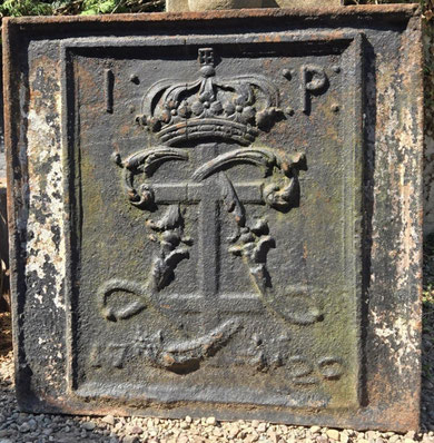 Die Kaminplatte trägt das Wappen des letzten Abtes der Abtei Staint Hubert Nicolas Spirlet (geb. 1715, gest. 1794; Amtszeit 1760-1794). Der Abt war "Maître de forge von Poix bei Saint Hubert und Châtelet bei Charleroi; er ließ zudem 1771 den St.-Michael-Hochofen im Waldgebiet von St. Hubert vornehmlich zum Gießen von Glocken errichten.